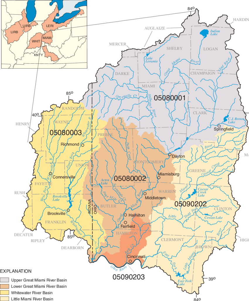 The Miami Watershed is in Southwest Ohio and Southeast Indiana and includes the Great Miami River Valley (left) and Little Miami River Valley (right).