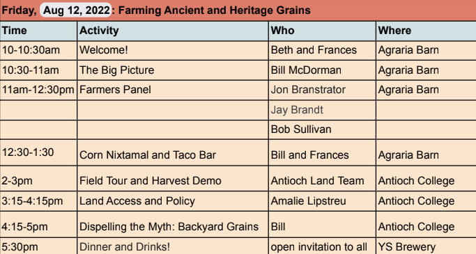 Agraria Center for Regenerative Practice has collaborated with Tecumseh Land Trust, Antioch College, Cornville Seed, Appalachian Staple Foods Collaborative, and Rural Action to offer a 3-day Grain School to our friends in the Midwest on August 12-14, 2022. Over the course of three days, participants will have hands-on experience on the topic of Ancient Heritage Grains. Join us for farmers panels, beer tastings, baking demos, and lectures on various grain related topics such as The History of Beer and Dispelling the Myth of Backyard Grains. Come for one day or all three days!